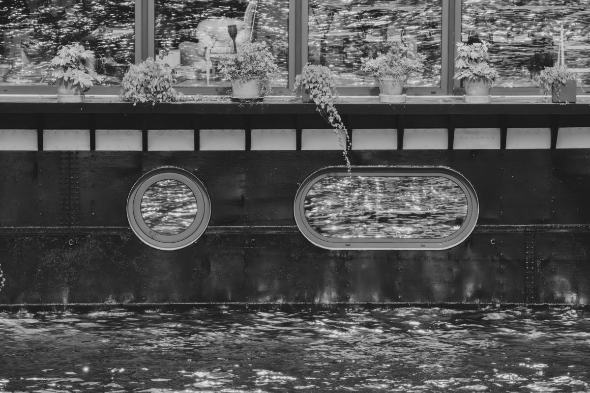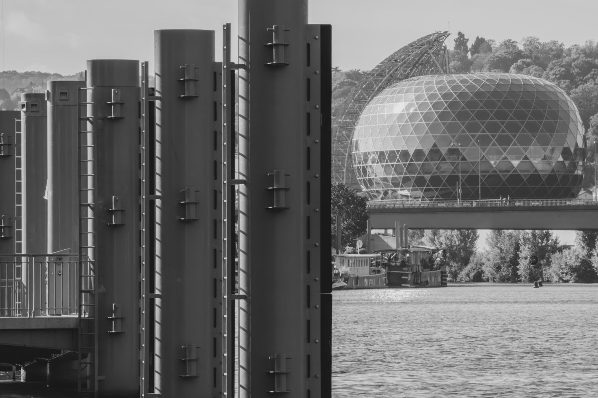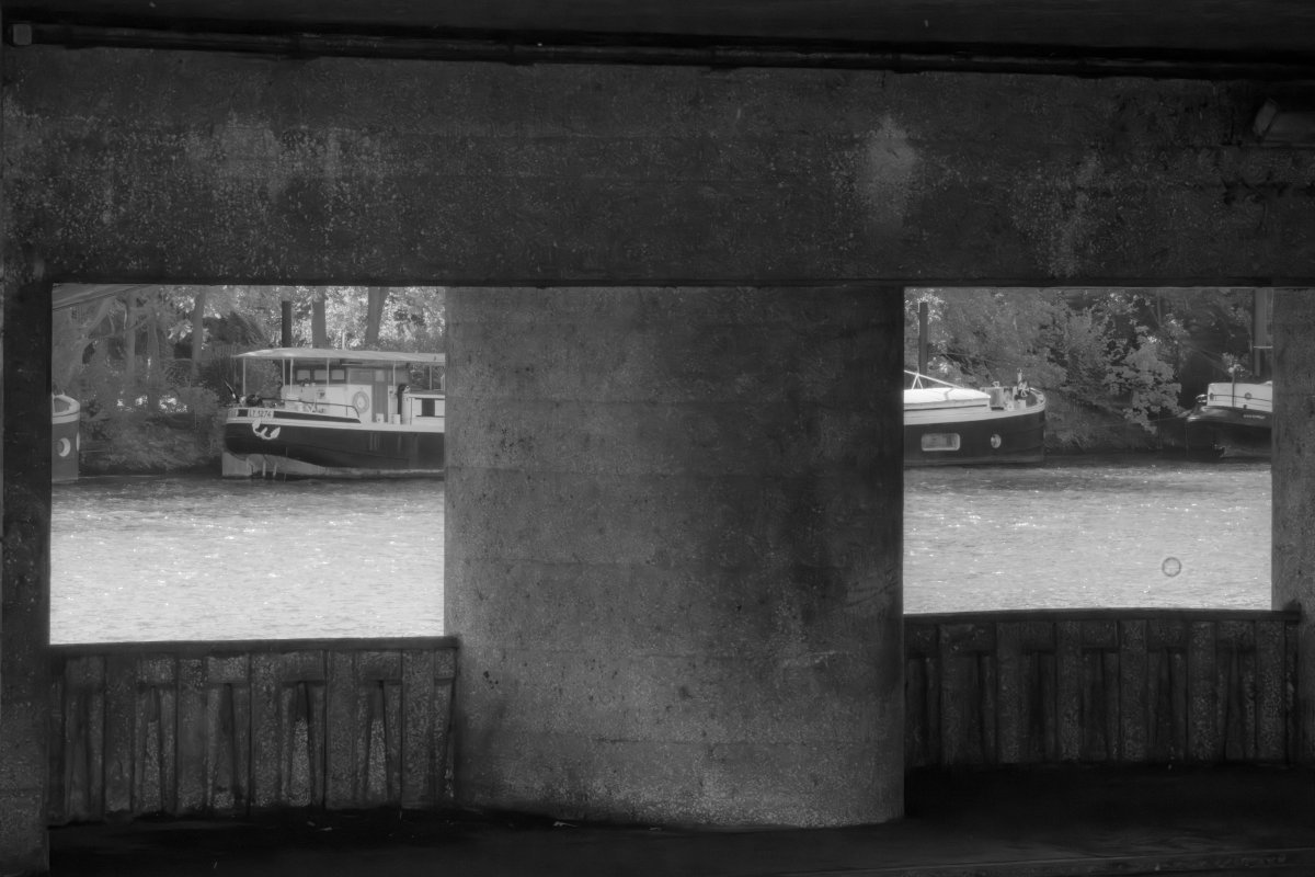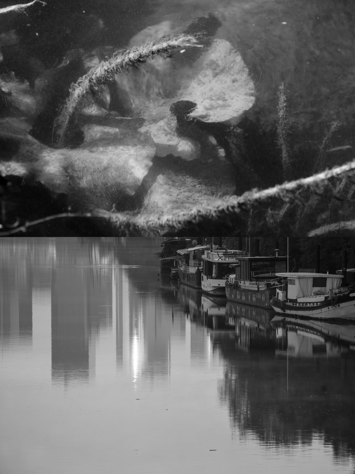 Ces résonances, je les explore à travers une série de compositions en noir et blanc. Chaque photographie est née de la rencontre de deux photographies, révélant une réalité autre, faite de correspondances et d’échos. Le noir et blanc s’impose comme une évidence, ouvrant un espace où la densité d’un ciel, la vibration d’un reflet et la texture de l’eau deviennent langage. Certaines images s’aventurent vers l’abstraction, bulles, végétaux immergés, traces mouvantes , respirations suspendues entre deux plans du monde, révélant ce qui se devine. Ces compositions sont autant de fragments d’un lieu en métamorphose, où architecture, nature et présence humaine s’entrelacent dans un dialogue silencieux, et où le visible, peu à peu, se transforme en mémoire.