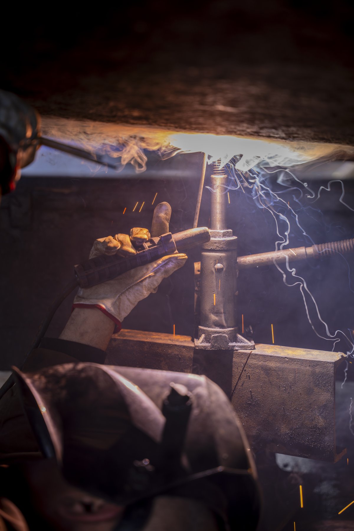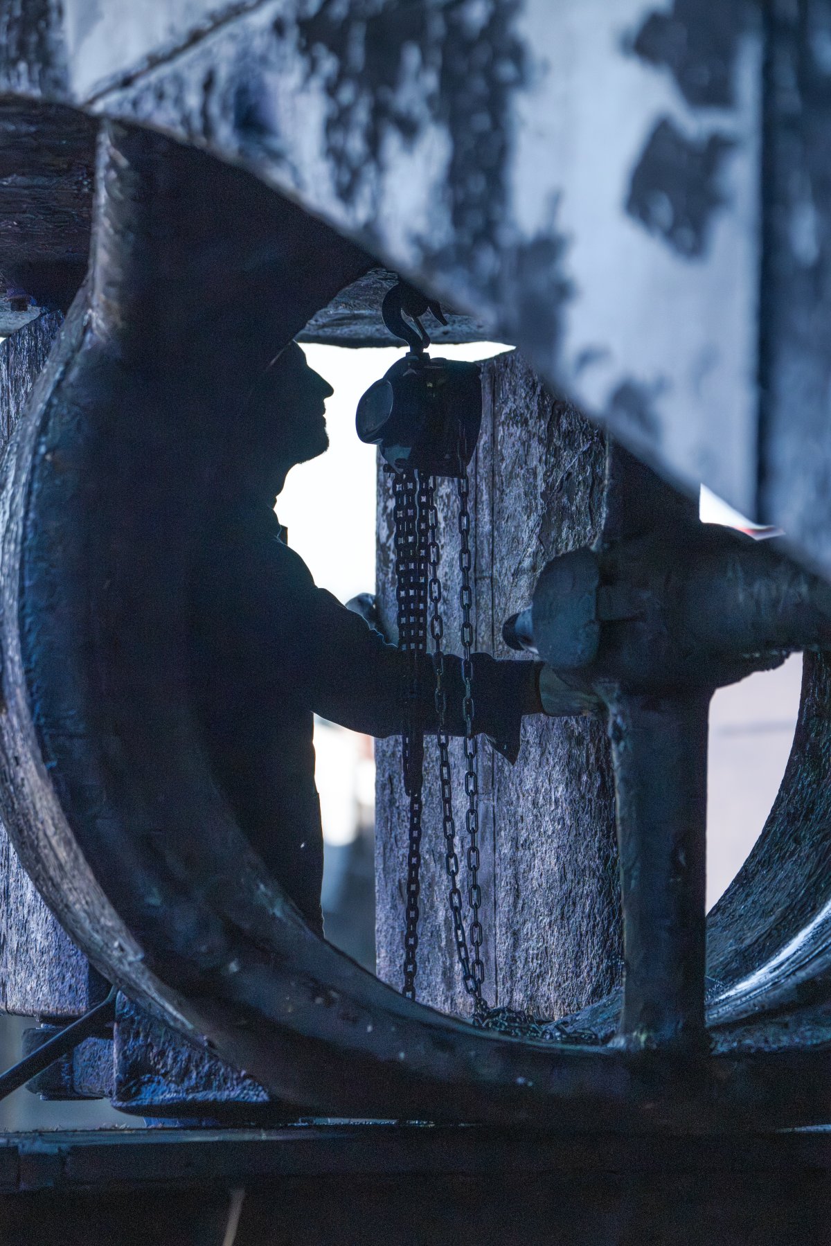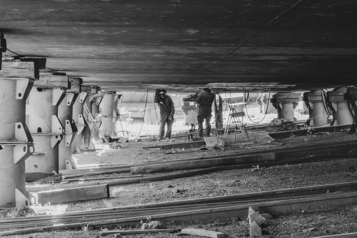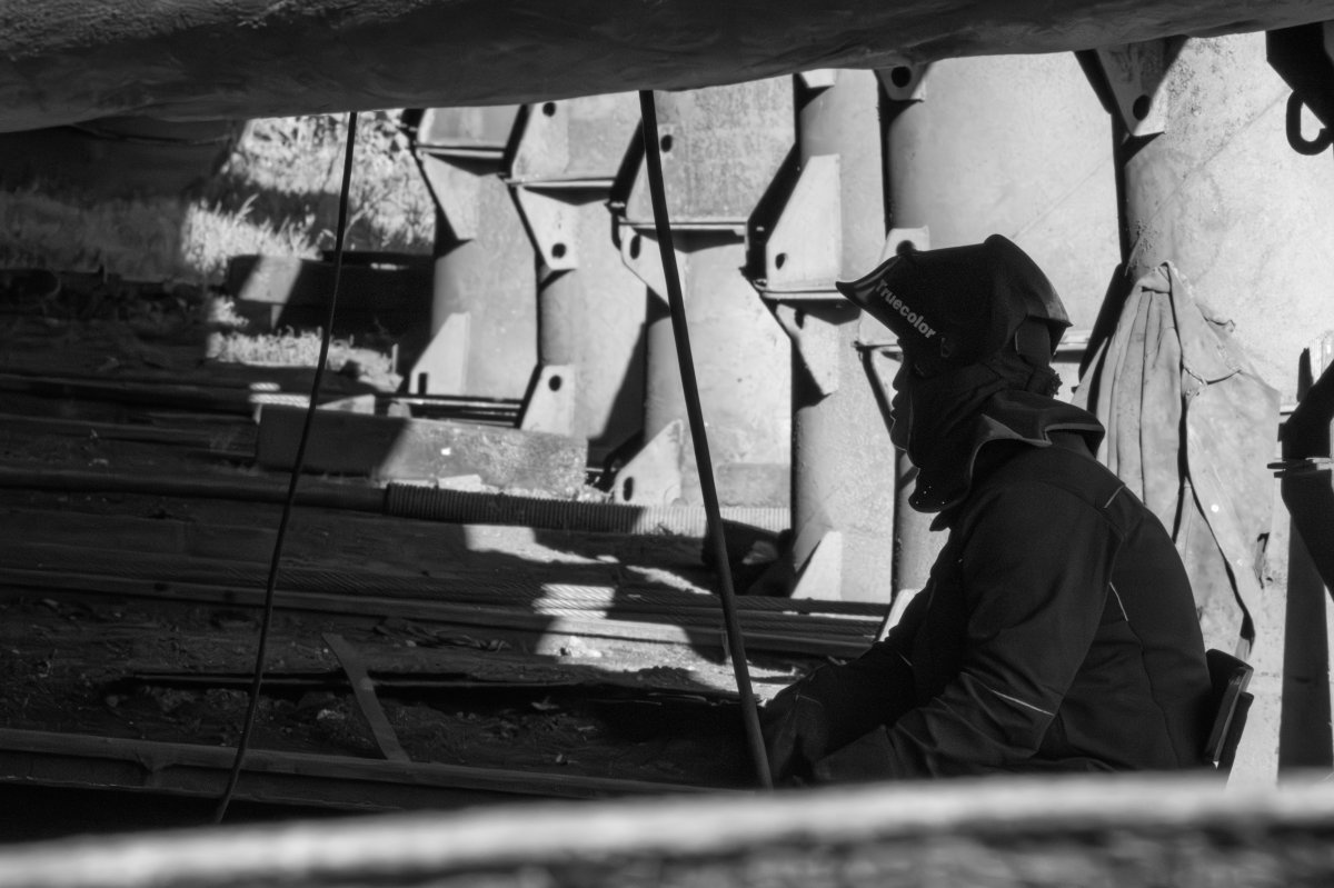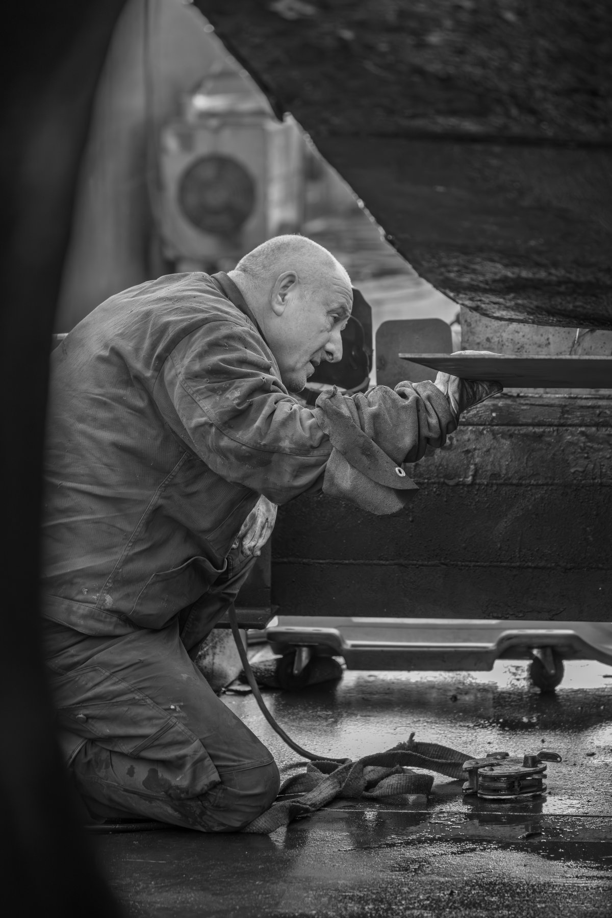 C’est un théâtre discret, une alchimie, où l’homme et le métal se mesurent, les corps, glissés sous la coque, profilées dans l’éclat des étincelles et dans la brume des fumées.